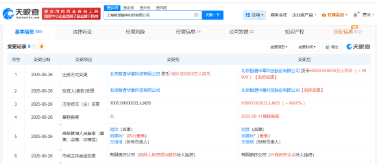 新浪科技讯 7月3日下午消息,天眼查App显示,近日,上海智谱寰宇科技有限公司发生工商变更,注册资本由1000万人民币增至5亿人民币,增幅4900%,同时刘德兵由执行董事改任董事。