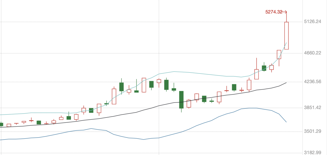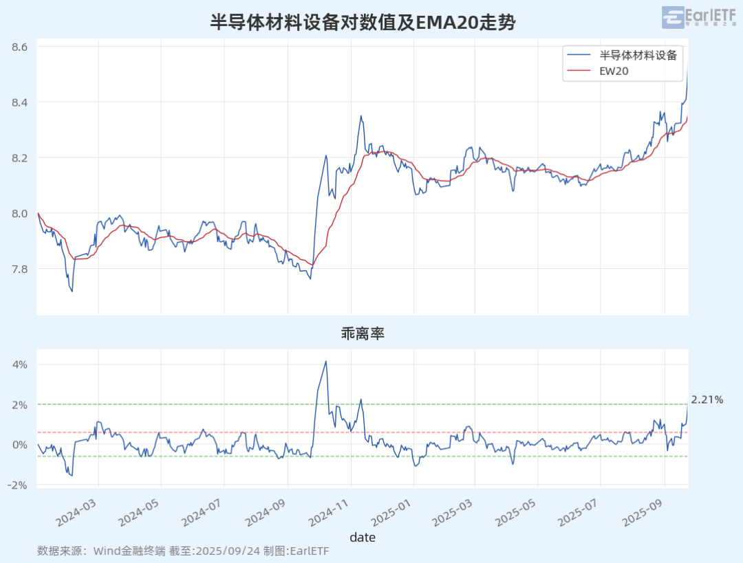 再看半导体材料设备指数,乖离水平更离谱一些,到了 2.21%。