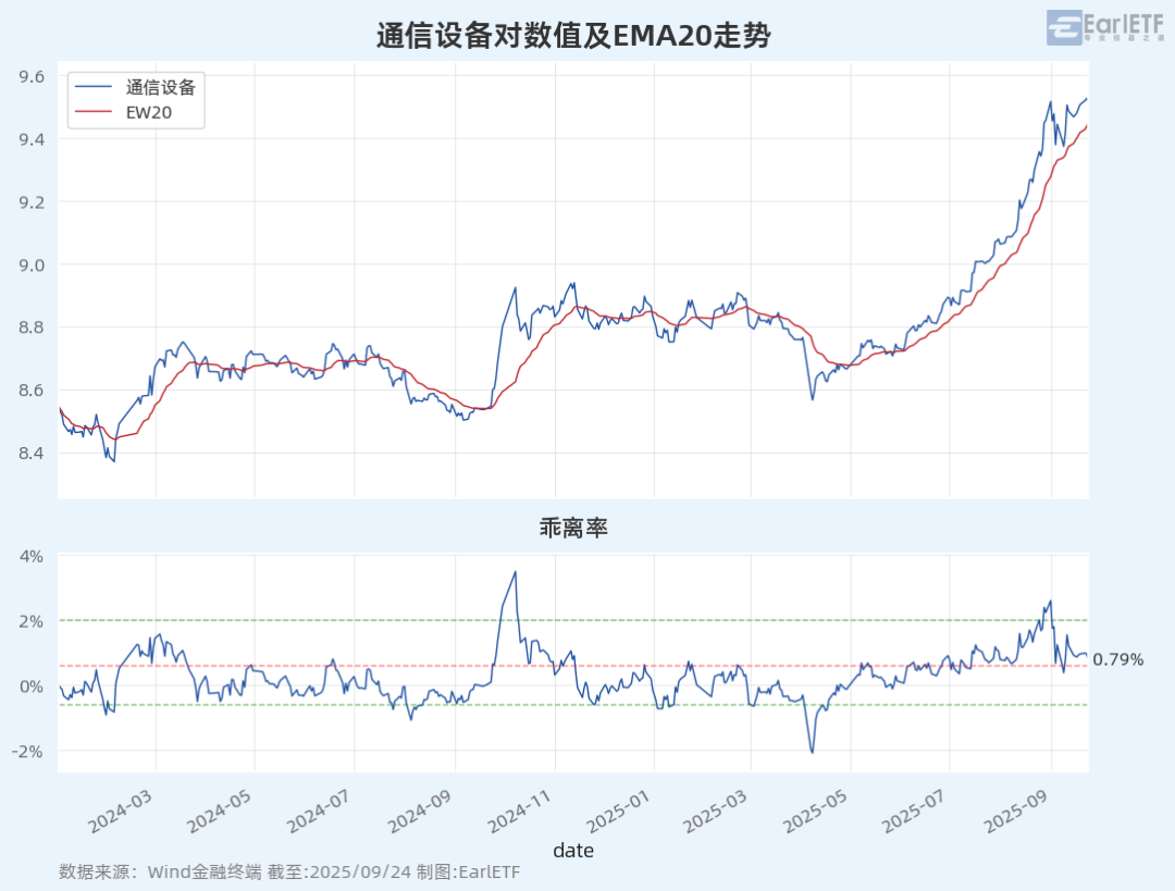 其实这块最近一次的案例,就是此前强势无比的通信设备指数,属于 7 月以来这波行情最强势的指数,在 9 月初乖离率触及 2%以上之后,先是大幅回调至20 日均线之上,然后反弹也并未能快速创出显著新高,与此同时20 日 EMA 均线则快速抬升,乖离率也因此随之滑落,目前只是 0.6%以上的甜点区。虽然相比同期许多一跌不起的指数,通信设备依然算强势的很,但深幅横盘调整大半个月,在这种行情下,是降低了赚钱效率的。
