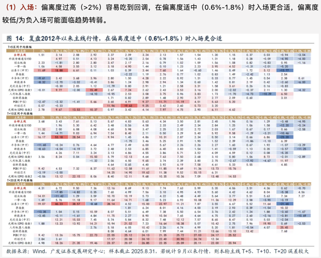 根据广发刘晨明提出判断主线风险的乖离率,当乖离率超过 2%之后,往往短期进入了高风险期,不宜追高。
