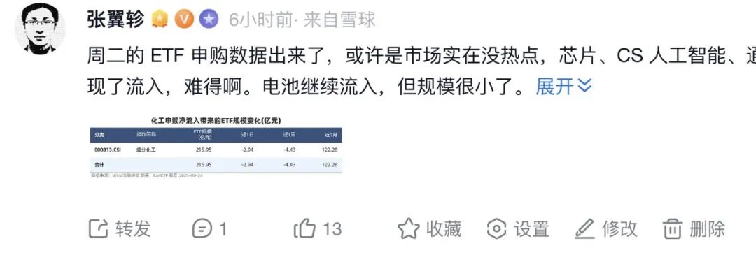 这里还要补充说明一下,交易所的这个数据每天早上才开始更新每个 ETF 的最新份额,我要等 Wind 将每个 ETF 的数据汇总至指数层面,然后再通过代码分拆指标成一个个大类的资金流向,所以这个数据往往要九点多才能算完,所以我就每天早上在雪球上更新一下,需要看各大类数据的,可以移步查看。
